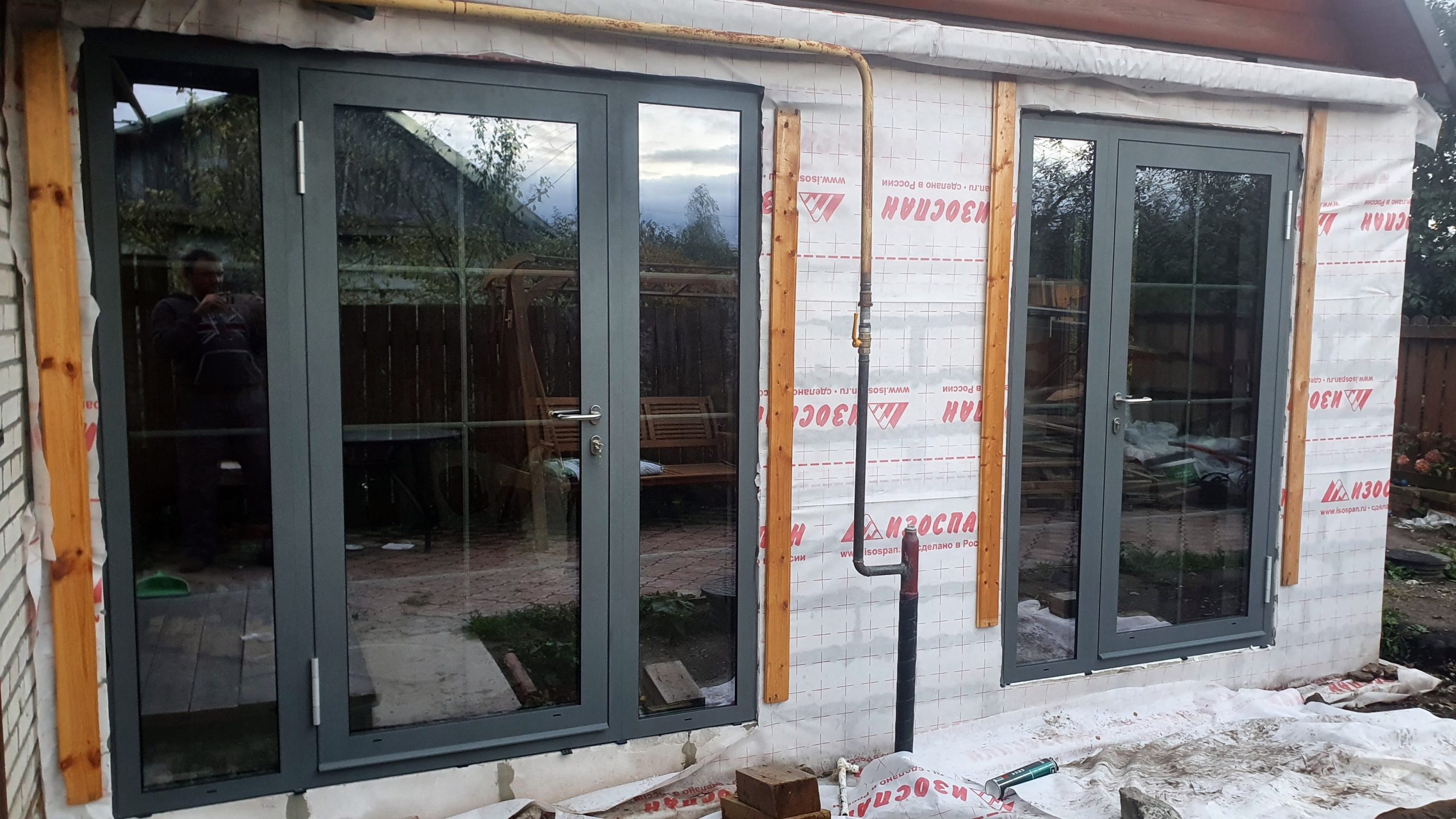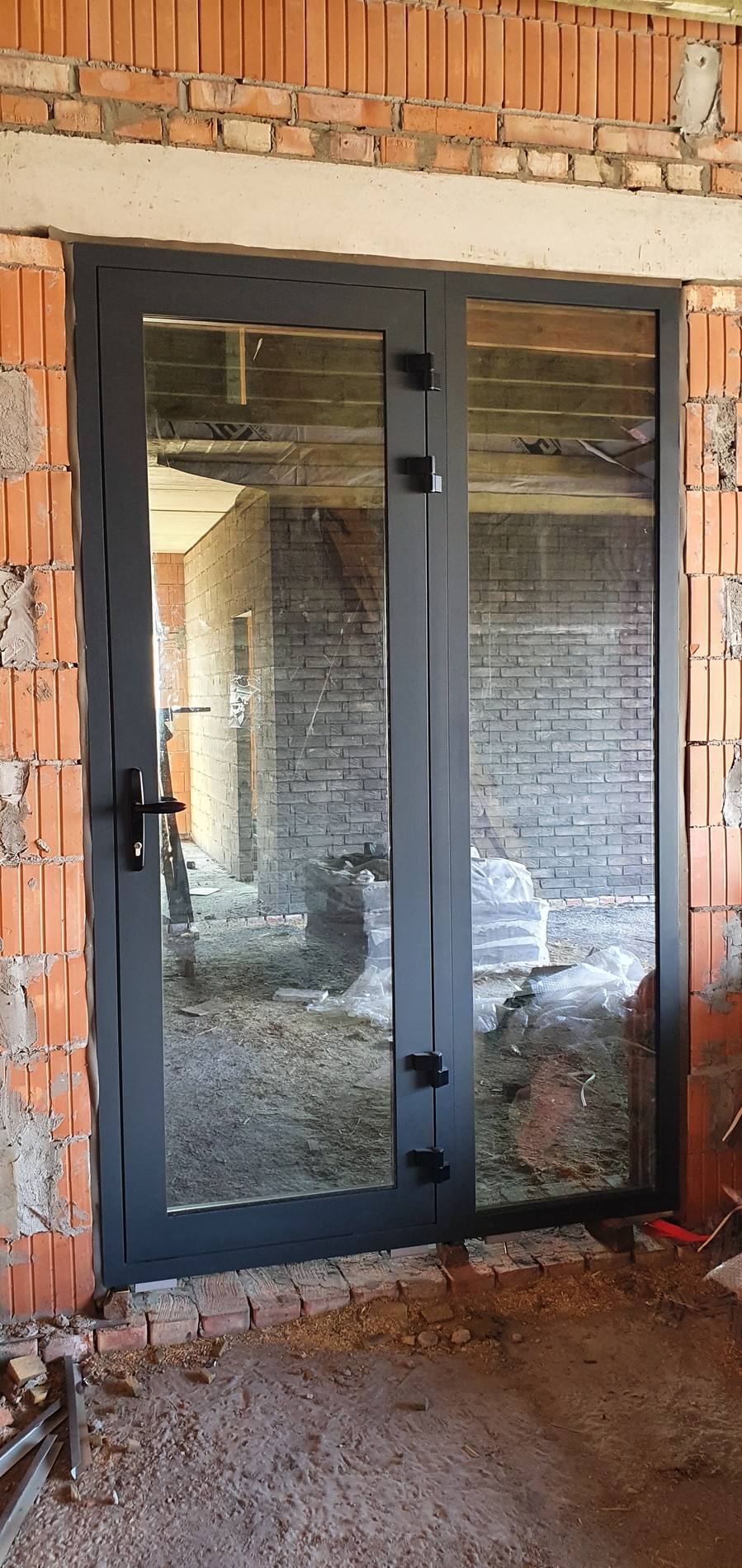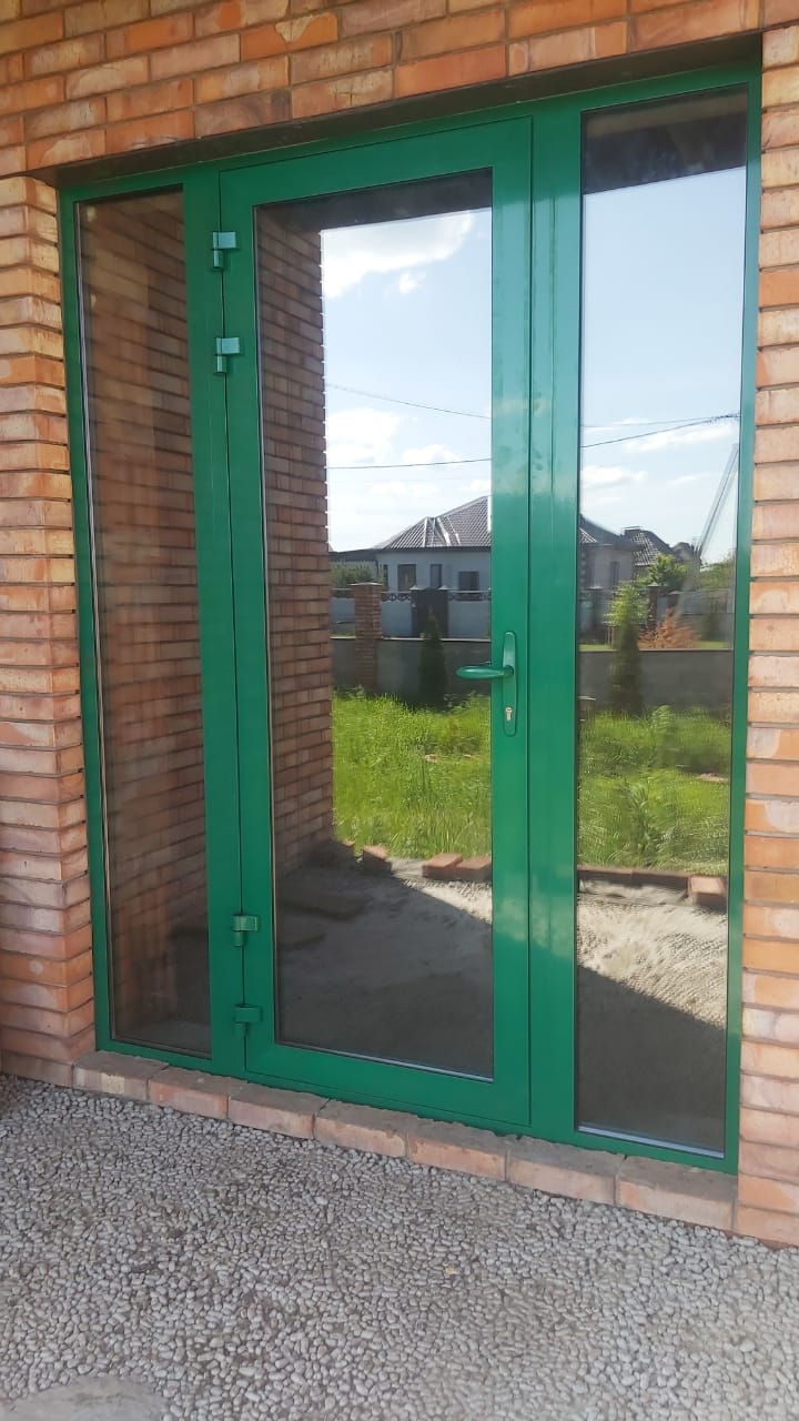 Делали остекление в беседку и по рекомендации продавца взяли двери из холодного алюминия. Двери стеклянные, две створки распашные широкие, летом постоянно открыты, похолодало или дождик — закрыли. Очень удобно и красиво. Мы довольны на все 100%